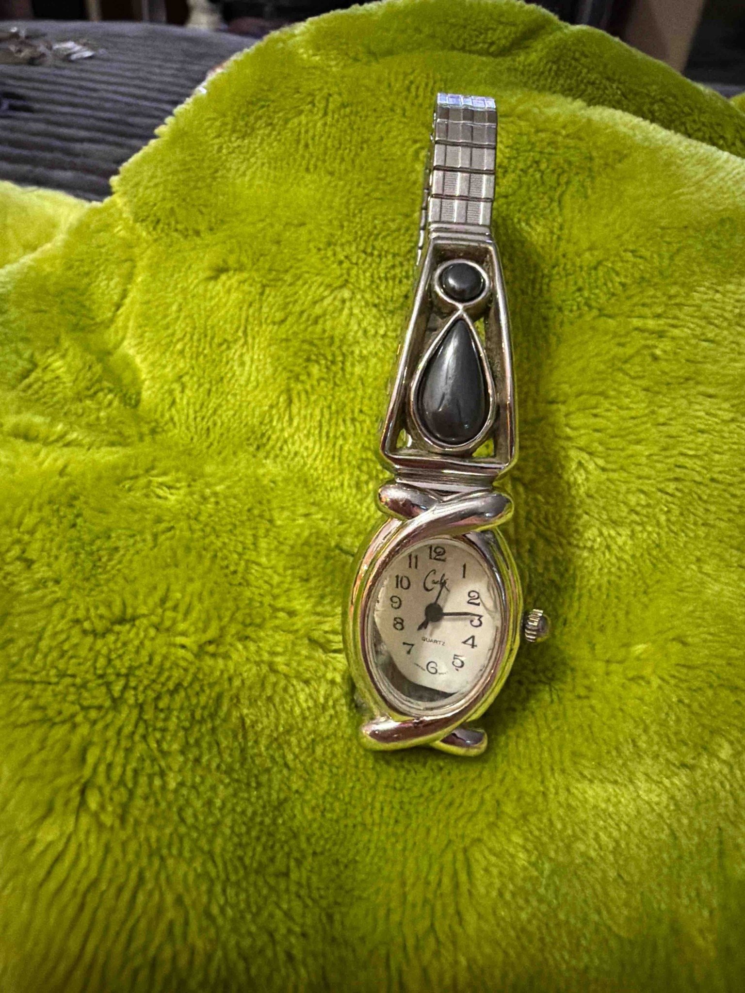 This is a vintage-style women's quartz wristwatch, likely a piece from Carolyn Pollack's 'Western Heritage' or similar Southwestern-inspired jewelry line. The watch features an oval white dial with black Arabic numerals and the cursive 'CP' logo, marking it as a Carolyn Pollack piece. The movement is quartz, as indicated on the dial face. The case and the decorative lugs are constructed from sterling silver (though hallmarks are not visible, this brand is synonymous with .925 silver). The unique design features an ornate decorative attachment above the watch face, holding a teardrop-shaped and a small circular black stone, likely onyx or jet, bezel-set within a triangular frame. The watch is attached to a standard stainless steel expansion (Speidel-style) band, which may be a later replacement or a secondary market pairing. Condition-wise, the silver shows a soft, natural patina with some surface micro-scratching indicative of moderate wear. The crystal appears clear with no major cracks. This piece represents typical Southwestern aesthetic jewelry from the late 20th century, specifically the 1990s or early 2000s, characterized by the use of silver and black stones.
