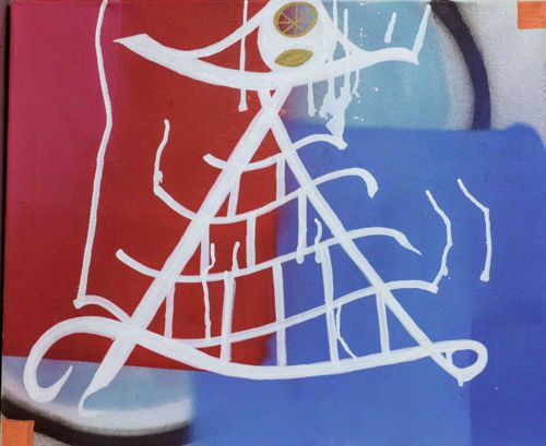 This is a contemporary abstract artwork measuring approximately 3709 x 3035 pixels. The composition is a mixed media construction, likely utilizing spray paint and thick acrylic or paint markers on a stretched canvas substrate. The background is divided into bold color blocks of vibrant red, deep blue, and a gradient of light blue-grey, featuring soft airbrushed edges characteristic of street art or urban contemporary styles. Layered over these colors is a prominent, gestural white line drawing that takes a pyramid or triangular shape filled with a grid-like pattern. The white paint shows significant 'drip' effects, indicating a high-viscosity application where the artist allowed gravity to pull the medium down the surface. At the focal point within the upper white arch, there is a small, detailed circular icon resembling a citrus slice or wheel in gold and purple, positioned above a small green leaf-like shape. In the bottom left, a white oval element with a dark border suggests a stylized foot or shoe, adding a post-modern, figurative touch. Condition-wise, the canvas appears taut with light texture visible through the matte paint. There are no obvious tears or abrasions, though the deliberately messy drips are an intentional stylistic choice rather than damage. The work lacks a visible signature on the front, consistent with an unknown artist, and reflects a late 20th or early 21st-century urban abstract aesthetic. The craftsmanship balances raw mechanical spray application with intentional, hand-drawn linework.