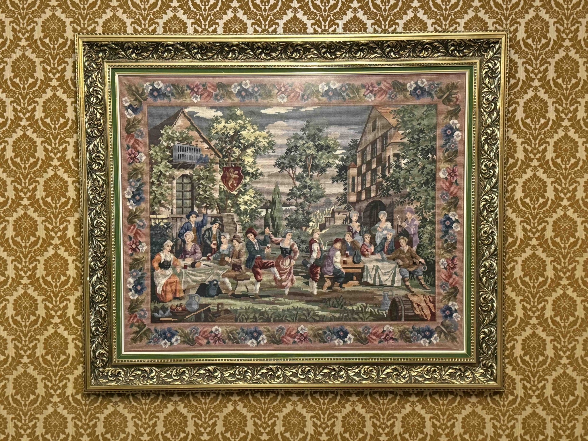 Framed Petit Point Needlepoint Tapestry: Tavern Courtyard Celebration