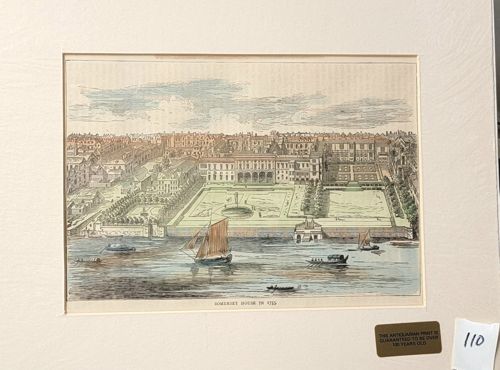 This item is an antique topographical print titled 'Somerset House in 1550'. It is a hand-colored engraving or lithograph that provides a historical bird's-eye perspective of the original Somerset House and its formal gardens situated along the River Thames in London. The print features fine line-work with delicate watercolor washes in shades of blue, green, and ochre, highlighting the architecture and the vessels on the water, including a prominent masted boat in the foreground. The work is professionally mounted in a cream-colored textured mat board. A distinctive gold label in the lower right corner states 'This antiquarian print is guaranteed to be over 100 years old,' suggesting it was likely produced or sold as a collectible in the late 19th or early 20th century, though it depicts a 16th-century scene. The condition appears fair to good; there is visible light foxing and overall yellowing/toning of the paper consistent with its age. Some slight vertical rippling suggests the paper has reacted to humidity over time. The craftsmanship is typical of high-quality decorative Victorian-era historical reproductions intended for study or interior decoration.