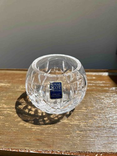This item is a spherical or 'rose bowl' style votive/tea light holder crafted from high-quality hand-cut lead crystal. It features a classic geometric cut-glass pattern consisting of deep vertical and cross-hatched miter cuts that effectively refract light, characteristic of traditional British crystal design. The piece is colorless and transparent, boasting the high refractive index and clarity associated with lead crystal. A notable feature is the original blue and gold rectangular foil label affixed to the front, which reads 'ROYAL SCOT CRYSTAL, HAND CUT LEAD CRYSTAL,' identifying its origin from the renowned Scottish crystal manufacturer. In terms of condition, the piece appears to be in excellent contemporary condition with no visible chips, cracks, or clouding (internal fogging). The edges of the cuts remain sharp, and the base exhibits minor shelf wear. Based on the branding and style, this piece likely dates from the late 20th century to the early 21st century. The craftsmanship is evident in the precision of the symmetric facets and the weightiness of the leaded glass material, which provides a premium feel and superior brilliance compared to standard soda-lime glass.