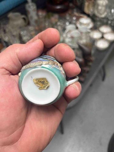 This is a vintage miniature porcelain teacup or espresso cup, likely part of a souvenir or novelty set. The item is constructed from fine white porcelain and features a distinctive iridescent lustreware finish in shades of seafoam green and soft blue on the exterior body. A notable relief or 'moriage-style' raised beaded decoration forms a wavy band around the upper portion of the cup, accented with gold-tone or bronze-colored highlights. The handle is slender and finished in a plain white glaze, contrasting with the colorful body. On the underside of the base, there is a prominent gold foil sticker with black lettering that reads 'CAPSCO MADE IN JAPAN,' identifying the manufacturer as CAPSCO, a known mid-20th-century Japanese exporter. The base is an unglazed foot ring surrounding a glazed white center. In terms of condition, the piece appears to be in good vintage shape with no visible cracks or large chips from this angle. The foil label shows significant wear, peeling, and discoloration, which is typical for its estimated age (circa 1950s-1960s). The lustre glaze remains vibrant, though minor surface wear or 'flea bites' may be present upon closer tactile inspection. The craftsmanship reflects typical Japanese export quality from the post-war era, prioritizing decorative shelf appeal and novelty value.