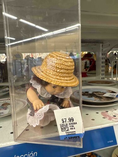 This item is a small, vinyl-faced collector doll housed in a tall, rectangular acrylic display case. The doll is depicted in a playful, crouching 'peek-a-boo' posture, common in mid-to-late 20th-century novelty dolls like those produced by Berjusa or similar manufacturers. Its head features painted facial details, including wide eyes looking slightly to the side and a small, pursed mouth. The doll wears a thick, woven straw hat with a rounded crown and a distinct brim. Its outfit consists of a dark red and black plaid bodice accented with a large white lace collar and white eyelet lace trim at the hem of the sleeves and skirt. Its hands and arms appear to be made of soft, light-toned vinyl with molded fingers. The doll’s brown hair is visible beneath the brim of the straw hat. The construction suggests an age range from the late 1970s to early 1990s. The acrylic case shows light surface scratches and dust consistent with shelf wear, and a retail price tag is adhered to the lower right corner. The doll itself appears in good condition with no visible fading to the textiles or damage to the vinyl, though it remains protected by the enclosure. The craftsmanship is typical of mass-produced collectible giftware of the era.