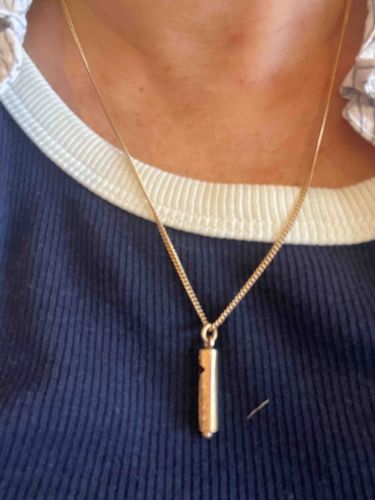 This item is a miniature functional whistle pendant suspended from a yellow gold chain. The pendant is cylindrical with a polished yellow gold finish, featuring a traditional whistle aperture at the top and a closed, slightly rounded base. Based on its visual characteristics, the pendant is likely crafted from 10k or 14k yellow gold, measuring approximately 0.75 to 1 inch in length. It is attached via a fixed jump ring to a fine curb link chain that appears to be about 16 to 18 inches long. The construction shows high-quality bench work with smooth transitions at the soldering points. While no hallmark is clearly visible in the image, such pieces are traditionally stamped near the bale or on the chain's clasp. The condition appears excellent with a bright, reflective patina and no visible denting or significant surface scratches, suggesting careful wear. Miniature functional jewelry of this style was particularly popular in the mid-to-late 20th century, often gifted as novelty 'safekeeping' charms. The uniform color of the metal suggests it is solid gold rather than plated, a key quality indicator for appraisal.
