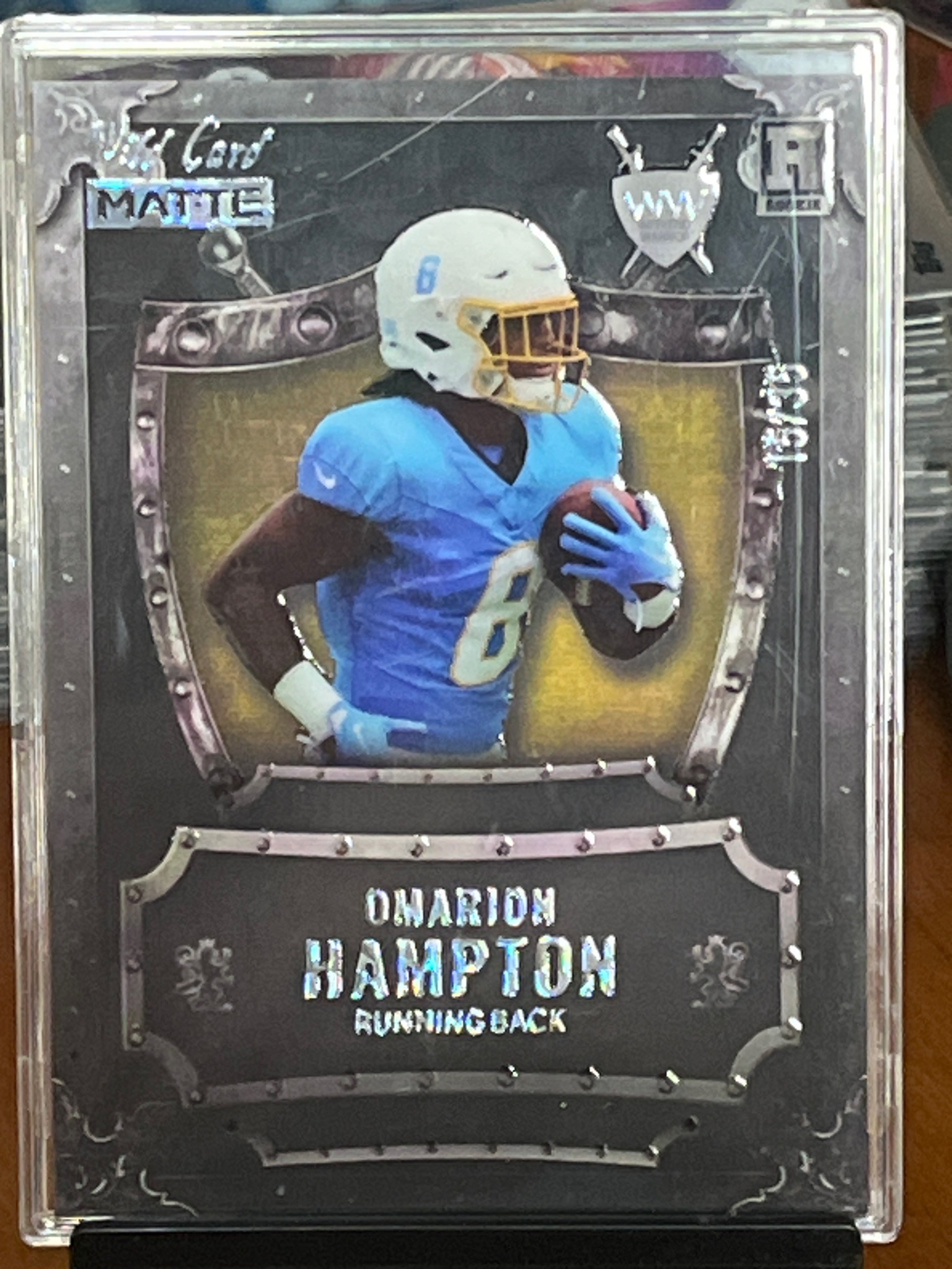This is a specialized sports trading card featuring Omarion Hampton, a running back in the collegiate/rookie phase of his career. The card is part of the 'Wild Card Matte' series, specifically the 'Ancient' or medieval-themed sub-set. It is constructed with a distinctive matte finish and features a layered holographic or silver foil effect on the text and borders. The design incorporates a detailed metallic shield motif that frames the central image of the player in action, wearing a light blue and yellow uniform. On the top right, a prominent holographic 'R' logo signifies its status as a Rookie card, alongside a shield-and-swords icon. Critically, the card displays a hand-enumerated serial number of '15/35' on the right edge, indicating it is an extremely limited production piece. The overall craftsmanship is high, utilizing thick cardstock typical of 'premium' modern collectibles. It appears to be in excellent condition, housed within a protective hard-plastic magnetic 'one-touch' holder, which has preserved its sharp corners and surface integrity. There are no visible surface scratches, corner softening, or edge chipping discernible in the current digital representation.