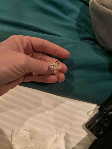This is a contemporary-style engagement ring, likely crafted from white gold, platinum, or high-quality sterling silver. The ring features a central round brilliant-cut stone, which is surrounded by a 'halo' of smaller pavé-set accent diamonds or multifaceted crystals. This halo design is intended to maximize the brilliance of the center stone and provide a larger visual presence. The shoulders of the band are also set with recessed pavé stones, extending approximately halfway down the shank for a continuous sparkle across the top of the finger. The metal displays a polished, high-shine finish, though closer inspection of the inside of the band would be necessary to identify hallmarks or quality stamps (such as 14K, 18K, or 925). The overall condition appears to be excellent with no visible missing stones or significant scratches on the metal surface. The craftsmanship suggests a modern manufacturing technique, likely from the early 21st century to the present. The ring's design is balanced, combining a classic solitaire silhouette with modern embellishments to create a high-quality aesthetic typical of modern fine jewelry boutiques.