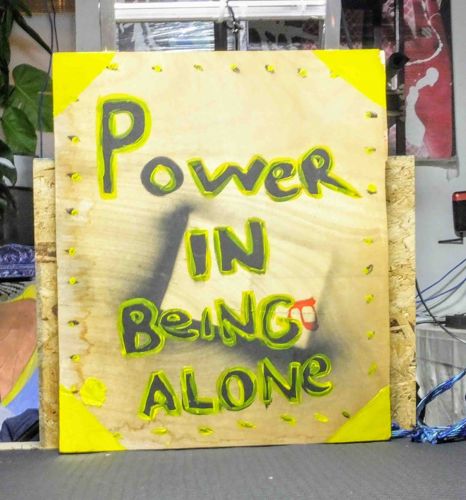 This contemporary mixed media artwork features the text 'POWER IN BEING ALONE' rendered in a bold, street-art inspired style. The piece appears to be executed on a light-colored wooden plywood substrate rather than a traditional canvas, measuring approximately 2165 x 2324 units. The typography consists of charcoal or dark grey block letters outlined with an irregular, vibrant neon yellow or chartreuse hand-painted border, creating a visually high-contrast effect. Construction details include visible metal fasteners or rivets along the vertical sides and bottom edge, accented with spots of neon yellow paint. The corners are also painted with bright yellow triangles, giving the piece a framed or reinforced aesthetic. A faint, dark spray-painted shadow or silhouette is visible behind the central text, adding a sense of depth and layered urban grit. The condition shows intentional raw edges and a slightly weathered surface typical of contemporary industrial-style art. There are small red accents or marks near the letter 'G' and 'N', possibly representing a signature or a deliberate graphic element. The overall craftsmanship reflects a raw, DIY instructional or protest-sign aesthetic, likely produced in the late 20th or early 21st century by an unknown artist focusing on empowerment and solitude motifs.