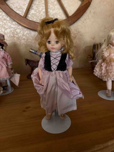This is a Madame Alexander collectible doll depicting the character Goldilocks, typically part of the Storyland or Fairytale series. The doll measures approximately 8 inches and is constructed from hard plastic with a vinyl face. She features curly blonde synthetic hair adorned with a black velvet headband and has articulated 'sleep eyes' with molded lashes. Her outfit consists of a pink satin or taffeta dress with a white lace-trimmed collar, topped with a black velvet-style bodice featuring lilac crisscross lacing detail. Undergarments likely include a white slip and bloomers. She wears tan or gold-toned shoes with small buckle details. The doll is mounted on a white circular metal display stand. Condition-wise, the hair shows some slight flyaways and minor loss of original styling, but the attire appears crisp without visible staining or tears. The skin tone is consistent with no obvious discoloration or plastic rot. This piece likely dates from the late 20th century, specifically the 1970s or 1980s, reflecting the high-quality craftsmanship and attention to detail associated with the Madame Alexander Doll Company.