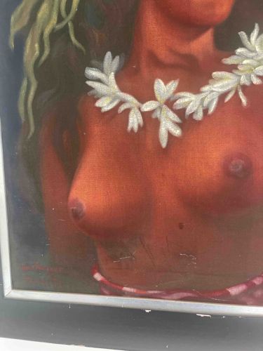 This is an original oil painting on canvas, depicting a topless Polynesian woman. The subject is shown wearing a white floral lei around her neck and appears to have long, dark hair with green foliage or lei accents tucked into it. The color palette is dominated by warm, reddish-brown skin tones contrasted against a dark, moody background. The execution of the anatomy shows a commitment to realistic lighting and shadow, particularly on the torso and neck. Based on the style and subject matter, this piece is reflective of the mid-20th-century 'Tiki' art movement, likely dating between the 1940s and 1960s. The canvas is housed in what appears to be a simple thin metallic or painted wood frame. Regarding condition, the painting shows visible signs of aging and wear. There are significant vertical surface scratches and paint loss visible on the lower portion of the subject's torso, just above the red-and-white patterned waistline. The canvas texture is prominent, suggesting a slightly thinner application of paint in some areas. There is an artist's signature or marking in the lower-left corner, rendered in red, though it is partially obscured and difficult to transcribe. The craftsmanship suggests a skilled hand with classical training in figure study, common for artists providing souvenirs or salon-style works during the mid-century Pacific travel boom.