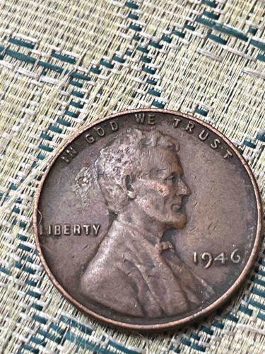 This is a 1946 United States one-cent coin, commonly known as a 'Wheat Penny' due to the reverse design. The obverse features the profile of Abraham Lincoln, as designed by Victor David Brenner. Struck in a composition of 95% copper and 5% tin and zinc, the coin exhibits a deep brown chocolate patina, indicating a 'Brown' (BN) color classification by numismatic standards. The date '1946' is clearly visible in the lower right field, and the absence of a mint mark below the date signifies it was minted at the Philadelphia Mint. The inscriptions 'IN GOD WE TRUST' and 'LIBERTY' are present. Regarding condition, the coin shows significant signs of heavy circulation; there is notable flattening of Lincoln's hair and cheekbone, and the rim shows moderate wear with several small contact marks or 'bag marks' throughout the fields. There appears to be some minor surface debris or localized corrosion behind Lincoln's head, which is typical for copper coins of this vintage that have been in general commerce for decades. The strike quality is average for the period.