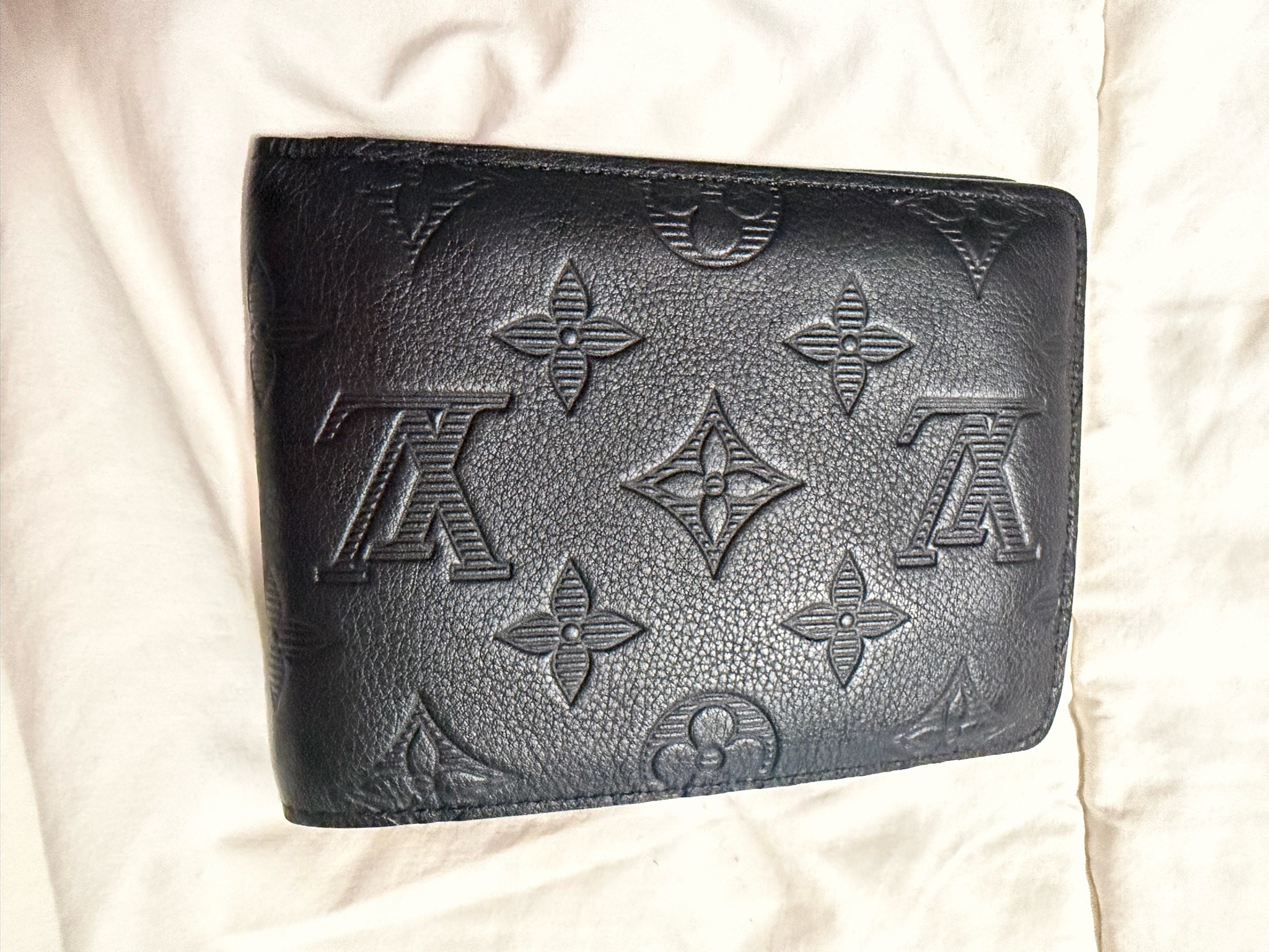 This is a luxury bifold wallet crafted from black Monogram Empreinte leather, a high-quality cowhide leather known for its supple feel and durability. The exterior features the iconic Louis Vuitton monogram pattern—consisting of the interlocking LV initials and floral motifs—all of which are deeply embossed into the pebbled-grain leather surface to create a distinct three-dimensional texture. This specific 'Multiple' model typically measures approximately 4.5 by 3.5 inches and is designed for a slim profile while offering tiered card slots and bill compartments. The construction shows precision tonal stitching along the perimeter edges, which appear to be sealed with a black glazing. In terms of condition, the leather exhibits a soft sheen and maintains deep, clear embossing, suggesting light use. There is minor softening at the spine where the wallet folds, and very faint wear at the corners, consistent with regular handling. The craftsmanship is indicative of modern Louis Vuitton production (post-2010), characterized by uniform graining and perfectly aligned symmetrical patterns. No visible tears, heavy scuffing, or major structural damage are present, and the material shows a healthy, supple patina without excessive dryness or cracking.