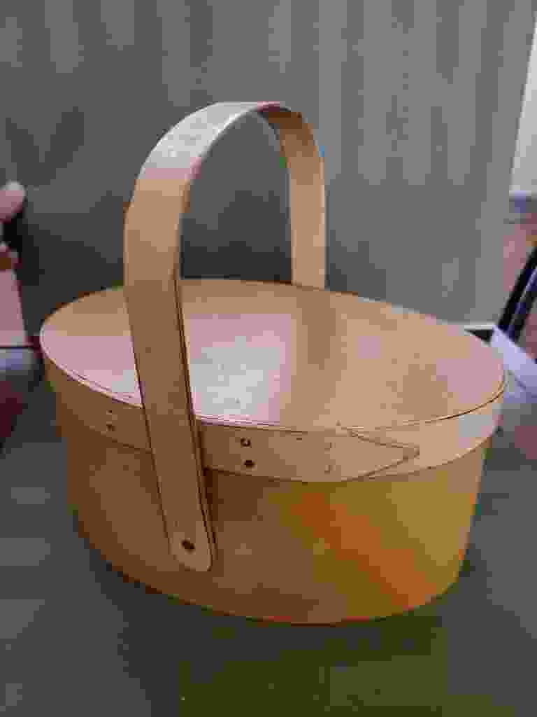 Workshop of David T Smith, yellow painted oval Shaker-style box with handle. 8.75" x 6" x 4".
