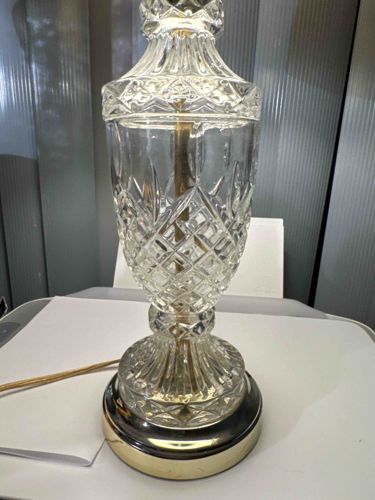 This is an elegant vintage table lamp featuring a body constructed from heavy lead crystal. The design follows a classic urn or trophy silhouette, characterized by deep, hand-cut geometric patterns. The central body displays a combination of diamond (cross-hatch) cuts on the lower half and elongated vertical leaf or lens cuts on the upper section, which are hallmarks of traditional glasswork from makers such as Waterford or various American Brilliant period manufacturers. The crystal sections are separated by a faceted neck and connected by a visible internal brass-tone metal rod that houses the electrical wiring. The lamp sits upon a circular polished brass-clad base, which shows light surface scratches and minor tarnish consistent with age. Reflective quality of the crystal remains high with no major clouding visible, though minor flea bite chips might be present along the sharper ridges of the cut facets. The electrical cord is a vintage-style gold-toned plastic, suggesting a mid-to-late 20th-century manufacture date, likely between 1960 and 1980. The craftsmanship represents high-quality decorative lighting with significant weight and light-refraction capabilities.
