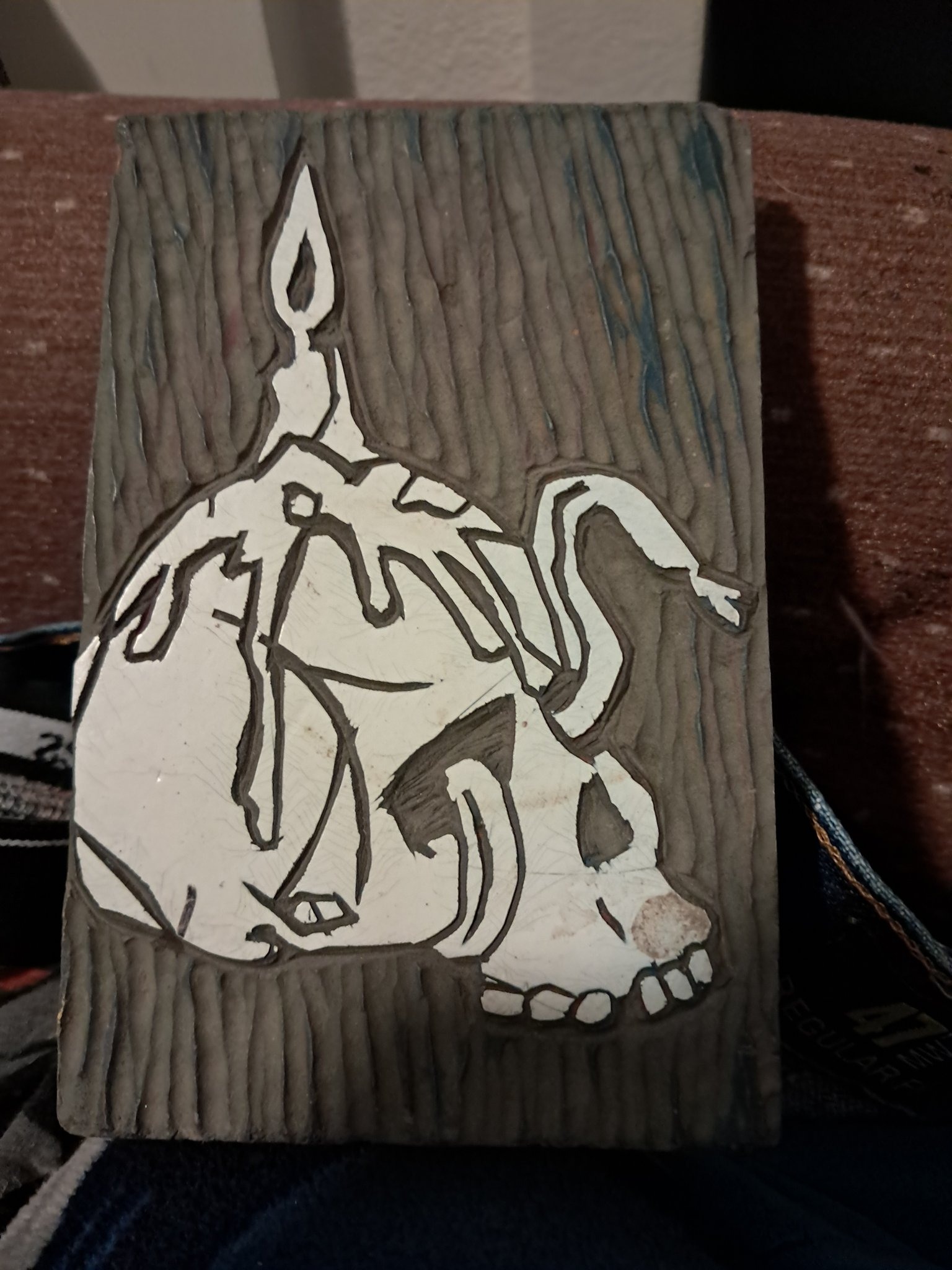 Hand-Carved Linoleum or Rubber Printing Block of a Skull and Candle