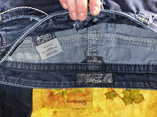 A pair of contemporary women's denim jeans from the brand Silver Jeans Co., specifically looking at the 'Frances' fit. Based on the interior labeling, the item features a Waist 25 and Length 31 (W25/L31) measurements. The construction consists of a dark indigo wash denim with heavy-duty contrast stitching, most notably the signature thick white decorative embroidery on the back pockets. The interior waistband displays multiple identifiers: a woven brand tag with paisley patterns, a size tag indicating the manufacturer 'Western Glove Works' and 'Made in China' (CA00508), and a black 'Frances 16"' fit tag. The material appears to be a cotton-rich denim blend with likely elastane for stretch. Physical condition shows moderate signs of use including some fading around the waistband and internal pilling common in second-hand denim. The metal hardware includes a branded button-fly closure. The styling is characteristic of early-to-mid 2010s fashion, focusing on a low-rise, slim-leg silhouette with a 16-inch leg opening. Quality indicators include reinforced stitching and intact interior labeling, suggesting solid retail-grade clothing manufacturing.