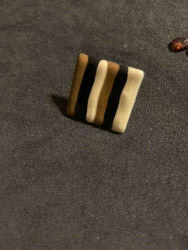 This item is a small, hand-fashioned ceramic square tile, likely intended for use as a sculptural element, decorative insert, or component of a piece of jewelry such as a brooch or large ring face. The piece measures approximately 1 to 1.5 inches square. It is constructed from stoneware or polymer clay, featuring a distinct vertically striped pattern. The color palette consists of alternating earth tones including a muted tan-brown, charcoal black, and a creamy off-white. Each stripe has been applied or joined in a layered, hand-rolled fashion, resulting in a gentle three-dimensional ribbing or undulation rather than a perfectly flat surface. The edges are slightly irregular and hand-finished, indicating studio craftsmanship rather than industrial mass production. The finish is matte to semi-matte, displaying a natural, tactile quality without high-gloss glazing. In terms of condition, the item appears well-preserved with no significant chips or cracks visible on the display face; however, there is a minor irregularity or slight compression on the rightmost white band consistent with the curing or firing process. The style is mid-to-late 20th-century modernist, reflecting an organic, minimalist aesthetic characterized by geometric simplicity and neutral tones. There are no visible maker's marks on the upward-facing surface.