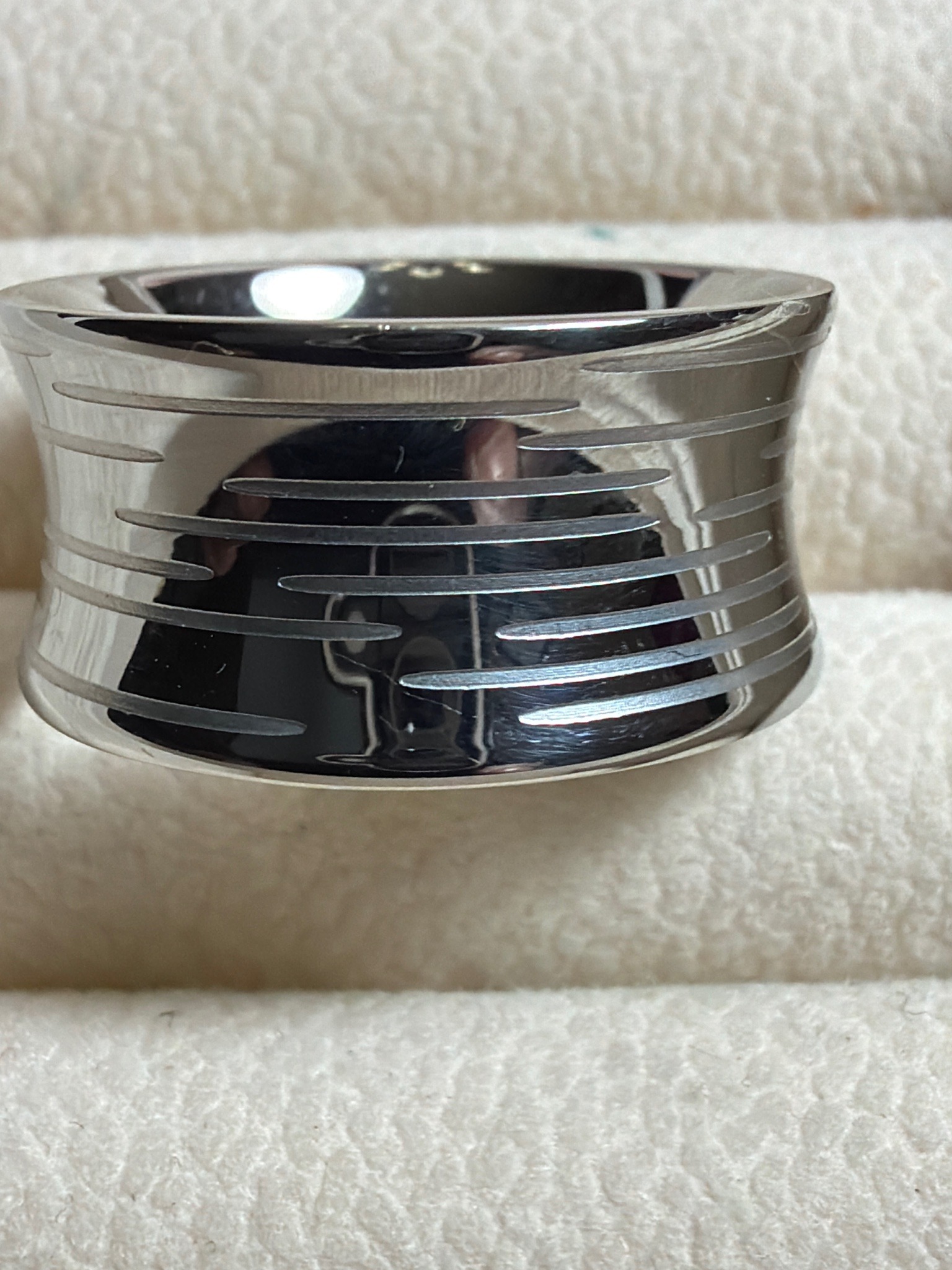 This item is a contemporary wide-band ring, likely crafted from a durable white metal such as stainless steel, titanium, or tungsten carbide, given its high-luster, mirror-like finish and cool silvery tone. The band features a distinct concave profile, curving inward from the top and bottom edges toward the center. It is decorated with an asymmetrical industrial motif consisting of multiple horizontal, recessed lines of varying lengths that wrap around the exterior. These engraved grooves have a matte or frosted appearance, providing a sharp textural contrast against the highly polished primary surface. The interior of the band appears to be smooth and potentially 'comfort fit' due to its thickness. Regarding condition, the piece shows minor surface-level micro-scratches and some light abrasions along the upper rim, consistent with gentle wear. There is no evidence of deep pitting or structural deformation. The craftsmanship is precise, with clean engravings and uniform edges, suggesting modern machine-aided manufacturing rather than hand-casting. This aesthetic aligns with early 21st-century minimalist or 'cyber' jewelry styles, often marketed in the contemporary men's or unisex fashion segments. No visible hallmarks or maker's marks are present on the exterior, though they may be located on the inner shank which is obscured in this view.