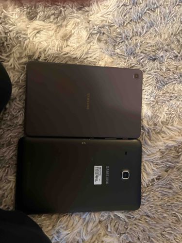 The image features two Samsung tablets resting on a textured, shaggy grey and white rug. The bottom device is a Samsung Galaxy Tab A 8.0-inch (specifically model SM-T377A as visible on the sticker), finished in a matte black plastic casing. It features a centrally located rear camera with a silver-colored trim and a vertical 'SAMSUNG' logo. A white product information sticker is adhered to the back, showing signs of slight peeling at the edges. Small white scuffs and debris are visible on the rear surface, indicating regular use. The top device appears to be a Samsung Galaxy Tab A7 Lite, identifiable by its more modern, slim-bezel design and the rear camera positioned in the upper corner without a flash module. This device has a dark grey or 'Oxford Gray' finish with a centrally placed Samsung logo in a landscape orientation. The construction appears to be a mix of metal and plastic. Both devices are in used condition; the SM-T377A shows more significant signs of surface wear and superficial scratches, while the top device appears cleaner but lacks its original packaging. No screen damage is visible as the devices are face-down, but the rear casings show standard cosmetic wear consistent with consumer electronics from the 2016-2021 era.