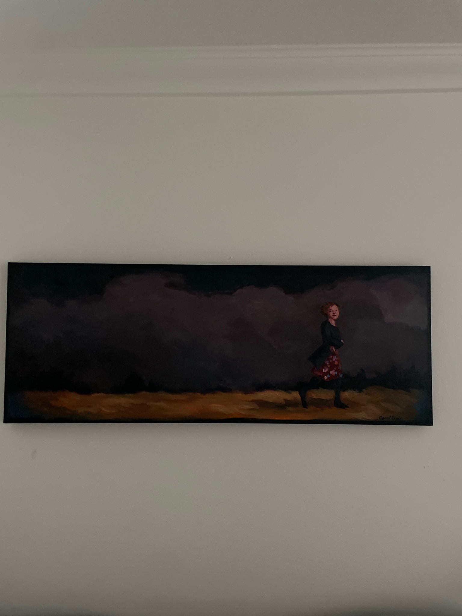 This original contemporary oil painting, executed on a wide rectangular canvas, portrays a lone female figure walking through a desolate or moody landscape. The artist, Canal Quinn, has signed the work in the lower right corner. The composition is characterized by a high horizon line and a vast, dark, atmospheric sky dominated by deep purples, grays, and blacks, suggesting a coming storm or twilight. The foreground consists of a textured, golden-brown field or path. The central figure is a young woman wearing a darker coat over a red patterned skirt and black tights, captured in a mid-stride pose that conveys a sense of movement and isolation. The paint application appears varied, with visible brushwork in the clouds and a more detailed rendering of the woman's face and clothing. Physically, the work is unframed and wrapped on a wooden stretcher, with the image continuing around the edges (gallery wrap). The condition appears excellent with no visible craquelure, paint loss, or sagging to the canvas. The style is modern figurative with a touch of magic realism, likely dating to the 21st century. The dramatic lighting and panoramic format enhance the narrative quality of the piece, showcasing strong craftsmanship in light and shadow manipulation.