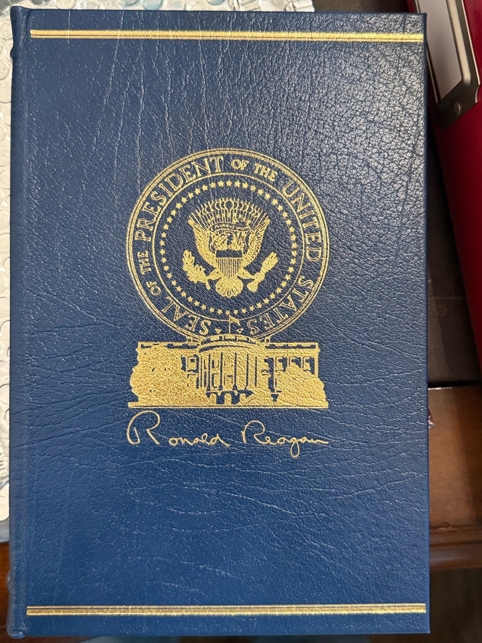 This is a hardcover book featuring a navy blue pebble-grained bonded leather or high-quality faux leather binding. The front cover is elegantly decorated with several gold foil-stamped elements: the Great Seal of the President of the United States at the center, a simplified silhouette illustration of the White House below it, and a facsimile signature of Ronald Reagan at the bottom. A single gold horizontal rule line accents the top and bottom edges of the front cover. The book appears to be in very good to excellent condition, showing sharp corners and clean gilt work with no visible fading or peeling of the gold foil. The textured grain of the cover material suggests a durable, commemorative construction typical of White House gift shop items or official administration publications from the 1980s. There are no obvious signs of spine damage, abrasions, or liquid staining on the visible front panel. The craftsmanship follows a traditional formal aesthetic used for executive office memorabilia, designed to portray prestige and historical significance.