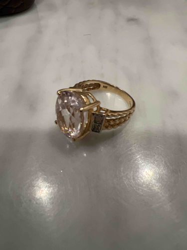 This is a statement ring crafted in 14k yellow gold, featuring a large, oval-cut center gemstone. Based on the peach-pink hue and clarity, the center stone is likely a natural Morganite, secured by a traditional four-prong setting. The shank of the ring exhibits a decorative cable or 'rope' twist design on the upper shoulders, which is further embellished by small, square-set colorless accent stones, likely diamonds or high-quality stimulants, housed in white metal boxes (possibly rhodium plating). The interior of the band is clearly stamped with '14K' and 'CHINA' markings, indicating the gold purity and origin of manufacture. The overall construction suggests a late 20th-century to contemporary mass-produced fine jewelry style. Physically, the gold shows a high-polish finish with minor surface abrasions consistent with light wear. The center stone appears well-seated with no visible chips at the girdle from this angle. The filigree-style openwork under the gallery allows light to pass through the stone, enhancing its brilliance. This piece represents a commercial-grade jewelry item often found in department stores or television shopping networks during the early 2000s.