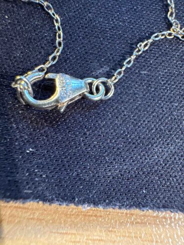 This item is a contemporary jewelry component consisting of a lobster claw clasp attached to a fine-gauge cable link chain. The metal exhibits a white, reflective luster consistent with sterling silver or white gold. The clasp is an elongated, teardrop-shaped mechanical fastener approximately 10-12mm in length, featuring a spring-loaded lever mechanism for security. On the flat side of the clasp's body, there are discernible hallmarks or stamped markings, likely indicating metal purity (such as '925') and potentially a manufacturer's mark, though the resolution limits absolute confirmation. The chain is composed of small, uniform oval links in a classic cable style, measuring approximately 1mm to 1.5mm in width. The condition appears sound with minor superficial surface scratches and light tarnish in recessed areas, consistent with normal wear and aging. The assembly reflects modern mass-production techniques characterized by precision casting and machine-made links. The style is minimalist and functional, typical of late 20th to early 21st-century jewelry design, intended for everyday use as a necklace or bracelet base. Quality is standard for fine metal findings, showing good articulation in the jump rings connecting the clasp to the chain.