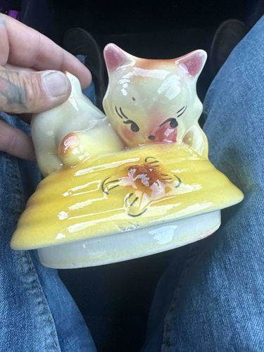 Vintage Anthropomorphic Cat on Yarn Mystery Jar Lid