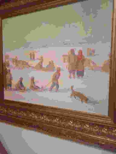 This artwork is an impressionistic oil painting on canvas or panel, attributed to the Russian painter Mikhail Nikolaevich Yakovlev (1880-1941/42). The composition depicts a vibrant winter landscape featuring various figures engaged in cold-weather activities, including children on sleds and a small dog in the foreground. The color palette is dominated by soft atmospheric tones of pale blue, white, and hints of pink in the snow, contrasting with the warmer earth tones of the figures' coats. The brushwork appears loose and textured, characteristic of the Russian Impressionist school of the early 20th century. The painting is housed in a substantial, ornate gilded frame with classical foliate and beaded molding, which shows a rich aged patina and some possible minor wear to the gilt finish consistent with its age. Yakovlev was known for his mastery of light and atmosphere, and this piece demonstrates his typical focus on everyday Russian life and seasonal changes. The craftsmanship exhibits a high degree of skill in capturing motion and light through varied impasto techniques. While the image resolution prevents a clear view of a signature, the style and thematic content align with Yakovlev's established body of work from the late 19th to early 20th century.