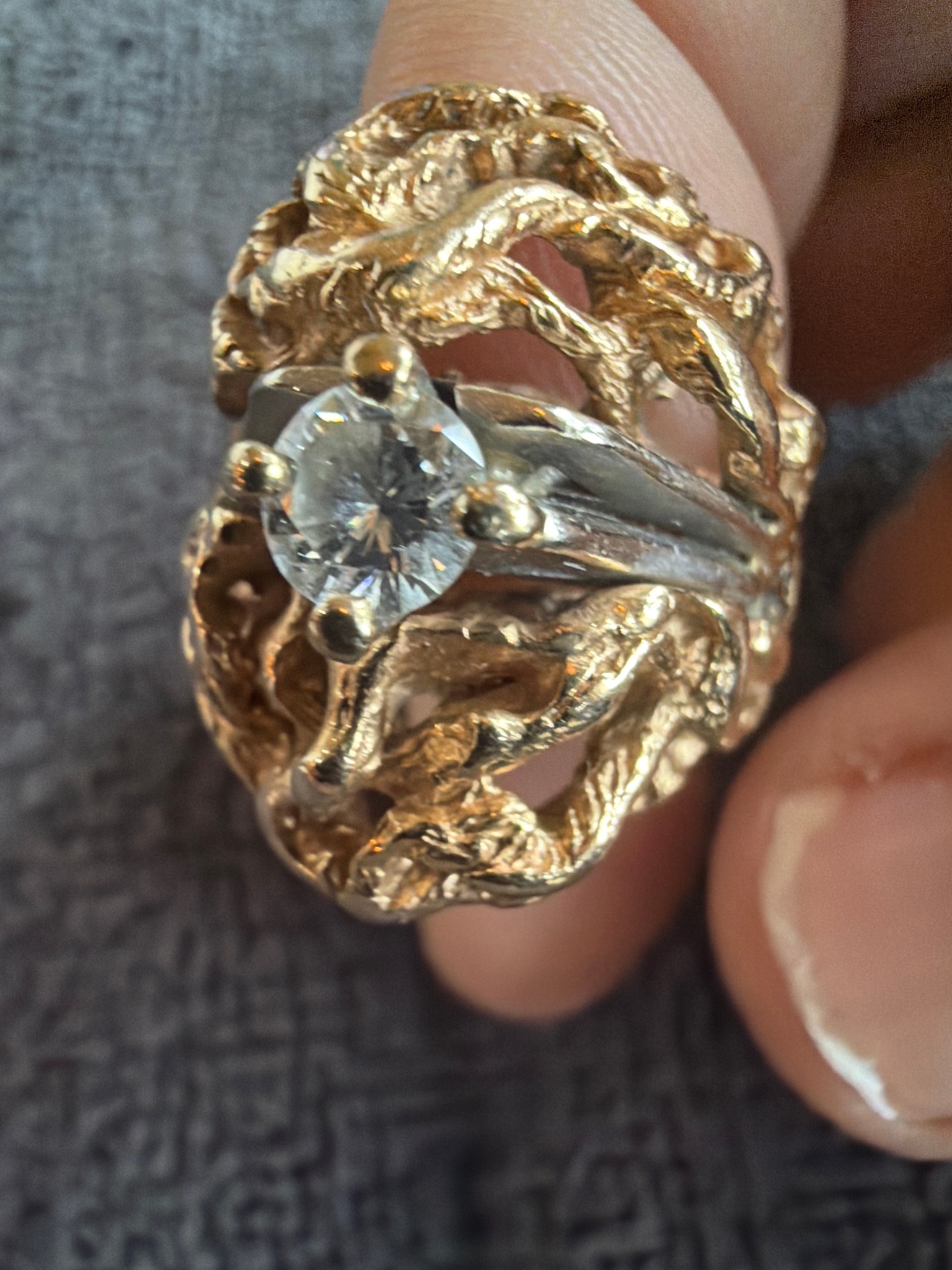 This is a distinctive example of Brutalist-style jewelry, likely dating from the 1960s to 1970s. The ring is crafted from yellow gold and features a highly textured, cast abstract design resembling organic branch work or 'lava' flow, which was popular during the mid-century modern era for its avant-garde, handcrafted aesthetic. The centerpiece is a round brilliant-cut diamond of approximately 0.50 to 0.75 carats, securely held in a four-prong setting that appears to be integrated into a white gold or platinum bridge within the larger yellow gold outer frame. The contrast between the polished, reflective diamond and the rough, matte-and-shine texture of the heavy gold casting is a hallmark of this design movement. The ring exhibits a substantial profile, wrapping around the finger with an openwork 'nest' construction that provides significant finger coverage. In terms of condition, there is minor surface wear and light scratching consistent with age. The gold shows some natural patina in the deeper recesses of the casting. There are no immediately visible maker's marks in the photo, though such pieces are often stamped on the inner band. The workmanship indicates a custom or high-end boutique production, prioritizing sculptural form over traditional symmetry.