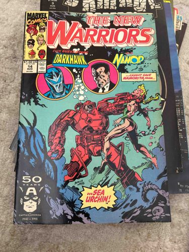 This is a vintage American comic book published by Marvel Comics, dated August 1991. The issue features 'The New Warriors' and highlights guest appearances by Darkhawk and Namor the Sub-Mariner. The cover art, illustrated by Mark Bagley and Sam de la Rosa, depicts a large red mechanical villain, Sea Urchin, subduing Namorita while Darkhawk and Namor appear in inset character circles above. A distinctive '50 Years of Captain America' (1941-1991) commemorative logo is visible in the bottom-left corner. The price is listed as $1.00 US and 65p UK. Physically, the comic shows signs of handling reflective of a used condition; visible wear includes spine stress marks (color breaking ticks), slight corner blunting, and edge wear along the right side of the cover. There is a noticeable vertical crease on the upper-right corner area. The colors remain vibrant, though the paper quality likely shows standard oxidation (tanning) characteristic of early 90s newsprint. No signatures or third-party grading (CGC) are present. The item belongs to the Copper Age of comic books (1984-1991).