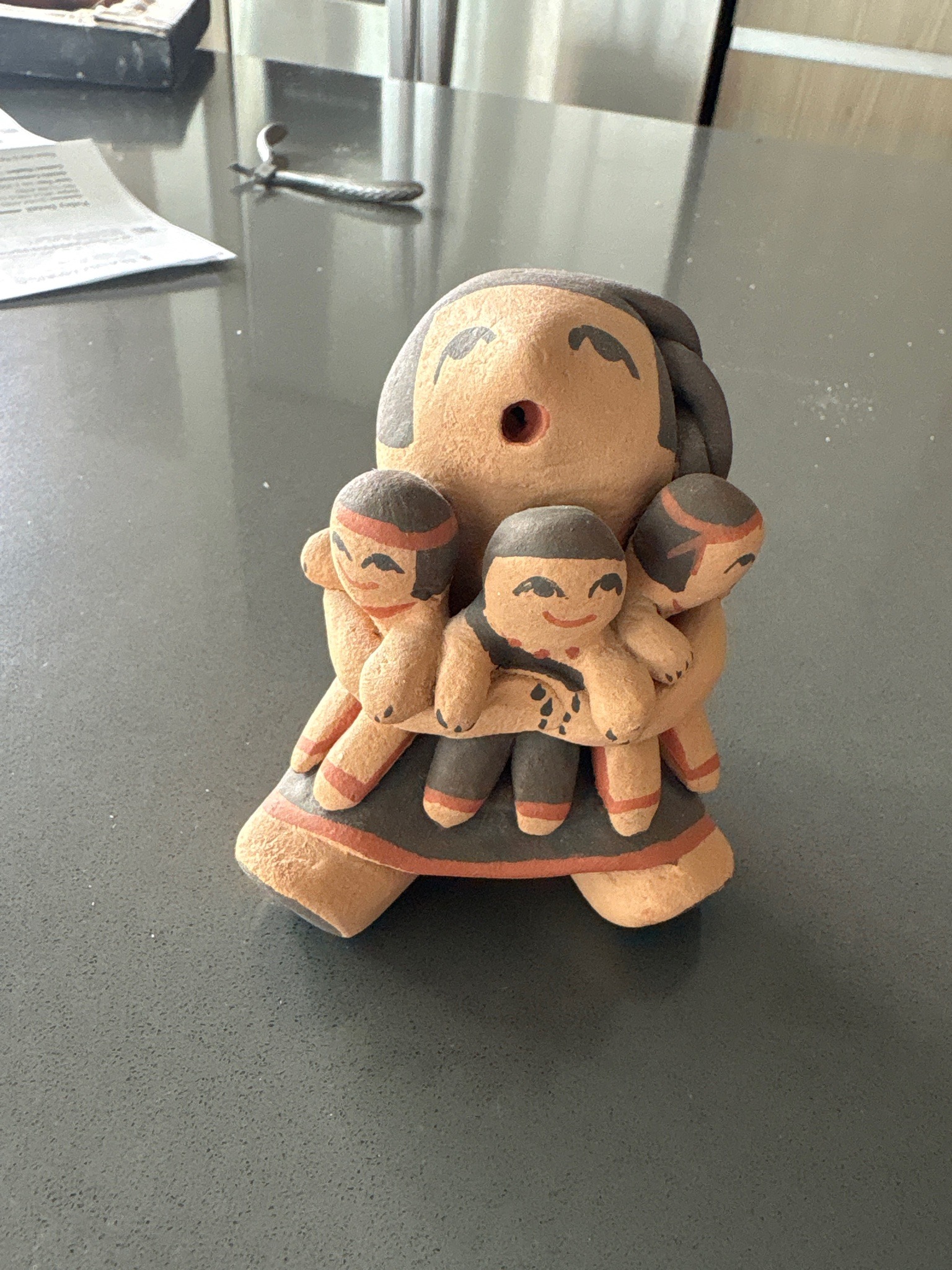 This is a hand-coiled and hand-painted terracotta clay figurine known as a 'Storyteller,' a traditional art form originating from the Cochiti Pueblo in New Mexico. The piece features a central seated female figure, the storyteller, with an open mouth signifying the oral tradition of passing down stories. Clinging to her are three smaller children figures, each rendered with simplified features and distinct black and red accents. The material is a natural buff-colored clay with matte pigments in black and rust-red (iron oxide slip). Its construction is characteristic of the late 20th-century folk art revival, likely dating between 1970 and 1990. The storyteller's dress and the children's hair bands are meticulously painted with traditional geometric patterns. The condition appears sound, with a soft, natural patina and no visible cracks or major chips, though there is minor surface wear and small scuffs consistent with age and handling. The work exhibits the charming, rounded proportions and warm aesthetic typical of authentic Pueblo pottery. While no artist signature is visible in this view (usually found on the base), the craftsmanship suggests a skilled artisan familiar with regional Southwestern techniques. The figure stands approximately 4 to 6 inches tall and is a classic example of cultural folk art.