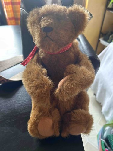 This item is a classic, medium-sized plush teddy bear featuring a medium-brown synthetic or mohair-blend fur. The bear is designed in a traditional style with a pronounced snout, small rounded ears, and a stitched black nose and mouth. Its eyes appear to be dark beads or hard plastic. A notable design feature is its jointed limbs, visible in the way the arms and legs are positioned, which is typical of high-quality collectable bears. Around its neck is a red ribbon with white polka dots, likely a later addition or a specific brand accessory. The paws are finished with a contrasting tan-colored suedette or felt material on the soles. The bear exhibits a seated posture with slight forward-leaning arms. In terms of condition, the fur appears somewhat matted or aged, suggesting use or long-term display, but there are no immediately visible tears or significant balding. This style of bear often mimics the aesthetic of early 20th-century Steiff or Boyd's Bears, likely dating from the 1980s to the early 2000s based on the synthetic sheen of the fur. No manufacturer tags are clearly visible in the image, but the overall craftsmanship indicates a mid-to-high tier decorative or giftware item rather than a mass-market toy.