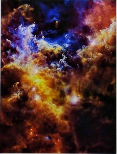 This item is a large-format vertical print (1483 x 1954 dimensions) depicting a celestial nebula or star-forming region, reminiscent of imagery captured by the Hubble or James Webb Space Telescopes. The composition features a rich, dynamic palette of golden ochre, deep indigo, and vibrant violet, creating a sense of immense depth and cosmic scale. The 'pillars' of gas and dust are rendered with soft, ethereal textures contrasted by sharp luminous points signifying young stars. The print quality appears high, showing smooth color transitions and deep black levels in the void areas of the interstellar medium. There are no visible maker's marks, signatures, or embossed stamps on the front of the image, suggesting it may be a modern digital reproduction onto high-quality photographic or archival paper. The condition is excellent with no visible tears, foxing, or fading apparent in the provided image. The style is strictly contemporary, likely produced within the last 10–20 years using advanced astronomical data processing techniques to visualize narrow-band emissions in visible light. The craftsmanship is evident in the clarity of the celestial structures and the lack of digital noise in the darker regions.