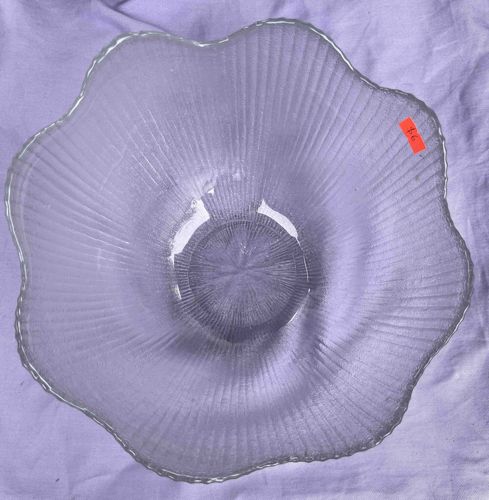 This is a circular clear glass bowl featuring a distinct scalloped or 'flower-form' rim with eight gentle peaks. The body of the bowl is characterized by pressed radial ribs or 'optic' lines that emanate from the circular base toward the wavy rim, creating a textured exterior and a smooth interior. Based on the user's observation that the glass glows green under 365nm UV light, the material is identified as manganese glass rather than uranium glass (which would glow brighter under 395nm). This interaction suggests a manufacturing date in the mid-20th century, likely between the 1930s and 1950s, when manganese was frequently used as a clarifying agent to neutralize the natural green tint of iron impurities in glass. The bowl appears to be pressed glass, exhibiting a sturdy thickness and uniform pattern. Physically, it remains in good vintage condition with clear transparency; a small orange price tag is visible on the inner rim, but no major chips or cracks are apparent in the overhead view. The style is consistent with Depression-era or early Mid-Century Modern kitchenware, often produced by American companies like Federal Glass or Anchor Hocking. The scalloped edges and textured ribbing provide both decorative appeal and a better grip for functional use as a fruit or serving bowl.