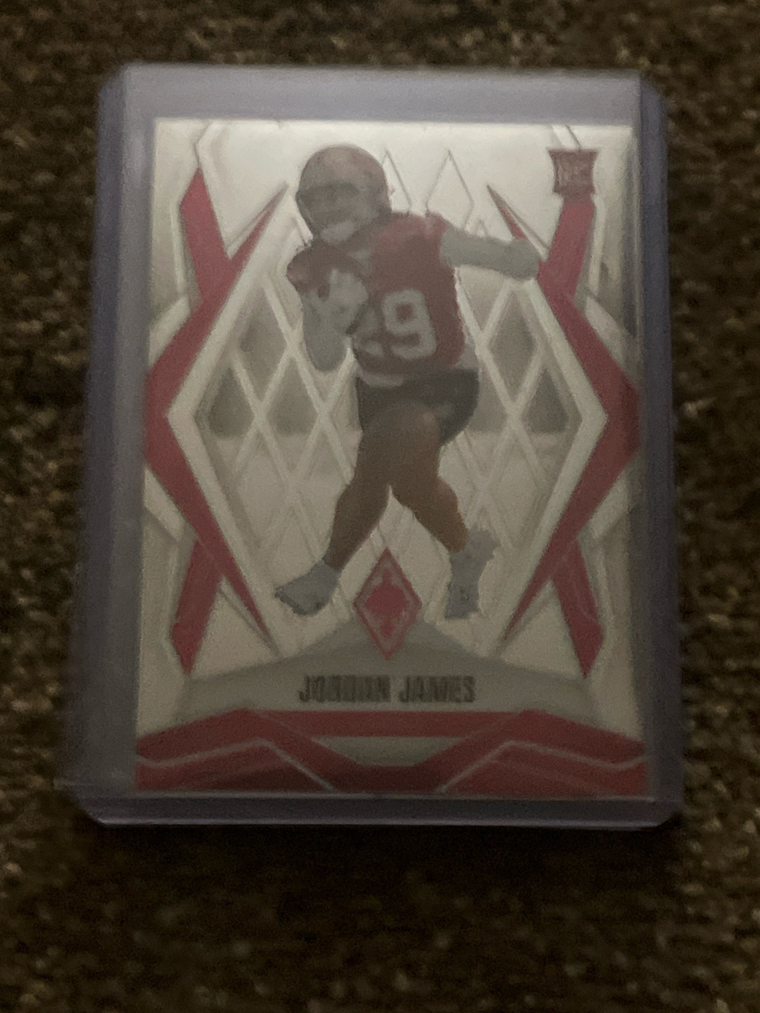 This is a modern sports trading card featuring running back Jordan James. The card exhibits the signature high-end design of the Panini Phoenix football series, characterized by a metallic, chrome-like finish with complex geometric patterns. The central image depicts James in an action pose wearing a red and black uniform (likely the Oregon Ducks). The background features a white and silver prismatic diamond pattern, framed by bold red 'X' shapes and a bottom chevron motif. A prominent 'RC' (Rookie Card) logo is visible in the upper right corner, and the name 'JORDAN JAMES' is printed in a stylized sans-serif font at the bottom center. The card is composed of premium cardstock with a glossy, reflective laminate coating. It is currently housed in a protective semi-rigid clear plastic top-loader, which has likely prevented significant surface wear. The centering appears slightly heavy toward the left side, though corners appear sharp through the plastic casing. There is no visible sign of heavy scratching or clouding on the card surface, suggesting it is in Near Mint to Mint condition. The Phoenix brand is known for its Opti-chrome technology, which provides a depth of field and premium feel to the card's surface.