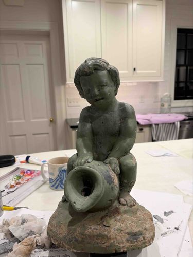 Vintage Cast Stone Putti Garden Fountain Figurine