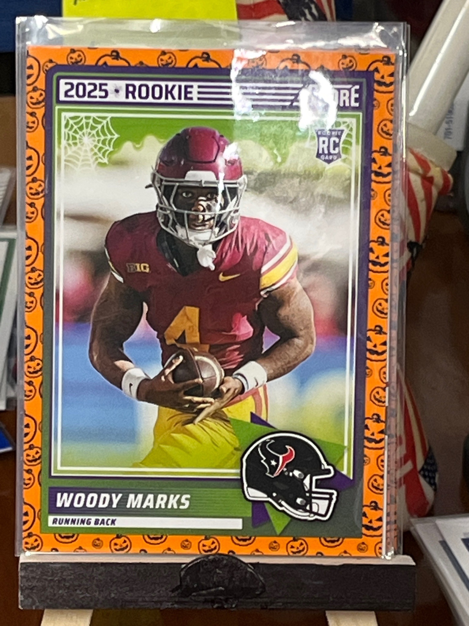 This is a 2024 Panini Score football trading card featuring USC Trojans running back Woody Marks, designated as a '2025 Rookie' prospect likely due to the timing of the set release relative to the NFL draft cycle. The card features a distinct Halloween-themed 'Pumpkin' parallel border, characterized by a vibrant orange outer frame populated with various jack-o'-lantern illustrations. The card's design includes a purple and lime green inner border, a spiderweb graphic in the top left corner, and the official 'RC' Rookie Card shield logo. The player is depicted in his cardinal and gold USC jersey, holding a football. A small graphic in the bottom right corner shows a Houston Texans helmet, indicating his professional affiliation. The card appears to be in Excellent to Near-Mint condition, housed inside a protective soft plastic sleeve (penny sleeve). There are no immediate signs of surface scratching, corner blunting, or edge wear visible through the sleeve, though minor manufacturing centering issues typical of thin-stock Score cards may be present. The printing utilizes a glossy finish on standard cardstock. This is a licensed Panini product and represents a modern collectible from the sports card 'junk wax 2.0' or hobbyist era.