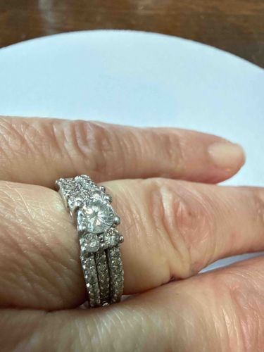 This is a contemporary three-piece wedding ensemble consisting of a central engagement ring flanked by two matching guard bands, crafted in a white metal that appears to be 14k or 18k white gold or platinum. The central engagement ring features a prominent round brilliant-cut center diamond, estimated at approximately 0.50 to 0.75 carats, securely held in a traditional four-prong setting. Flanking the center stone on the engagement band are four smaller round diamonds in a graduated cluster arrangement. The set is completed by two curved enhancer wedding bands, each pavé-set with a continuous row of small round diamonds along the top half of the shank. The construction shows a modular 'insert' design where the engagement ring fits snugly between the two outer bands to create a wide, cohesive look. The diamonds appear colorless to near-colorless with good brilliance. Condition-wise, the rings show light surface abrasions and minor wear on the prongs consistent with regular use, but all stones appear intact. The craftsmanship is high-quality, typical of modern fine jewelry from the late 20th to early 21st century.