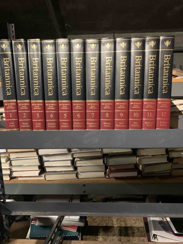 This is a partial set of the Encyclopædia Britannica, specifically volumes 1 through 12 of the Micropædia: Ready Reference. These volumes are part of the iconic 15th edition, which was originally introduced in 1974 and continued in various printings through 2010. The books feature a distinctive library-style binding with a three-tone color scheme: a dark navy blue or black upper spine, a maroon or deep red lower spine, and gold gilt lettering and logo accents. Each spine displays the 'Britannica' name prominently in gold serif font, topped by a gold crest. A horizontal gold band separates the dark upper section from the red lower section, which houses the volume numbers (1-12) and alphabetical range indicators. In terms of physical condition, the volumes appear relatively well-preserved for their age, though there is visible shelf wear. Notable condition issues include minor scuffing on the top and bottom of the spines, slight fading of the gold lettering on some volumes, and dust accumulation consistent with long-term storage on open metal shelving. The paper edges show minimal yellowing from this angle, suggesting they were kept in a climate-controlled environment. The set represents a high standard of 20th-century mass-market instructional craftsmanship, utilizing sturdy buckram cloth bindings designed for frequent handling in homes or libraries.