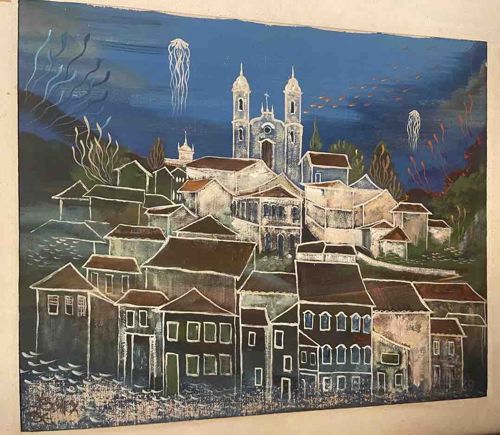 This is an original mid-century surrealist landscape painting, executed in a mixed media style likely featuring oil or gouache on a high-texture substrate. The composition depicts a densely packed European-style coastal village, dominated by a prominent twin-towered basilica or cathedral at the peak. The aesthetic is heavily influenced by the Naïve art movement and mid-century modernism, utilizing a dark, moody palette of deep Prussian blue, earthy ochre, and warm browns. A distinguishing surrealist element is the integration of marine imagery into the sky, featuring floating jellyfish with elongated tentacles and schools of fish swimming above the rooftops, suggesting a sub-aquatic or dreamlike atmosphere. The artist uses heavy impasto and sgraffito-like white outlines to define the architecture, giving the piece a graphic, dimensional quality. Small white fish-like strokes populate the bottom foreground, creating a sense of movement. There is a visible artist signature in the lower-left corner, though it is stylized. Given the year 1969 provided, the work is a prime example of late 1960s avant-garde illustration. The condition appears fair to good; there is some noticeable edge wear, slight pigment darkening, and what appears to be minor craquelure consistent with 50-plus years of age. The brushwork shows confident, rhythmic application, indicating an experienced hand with a clear stylistic vision.