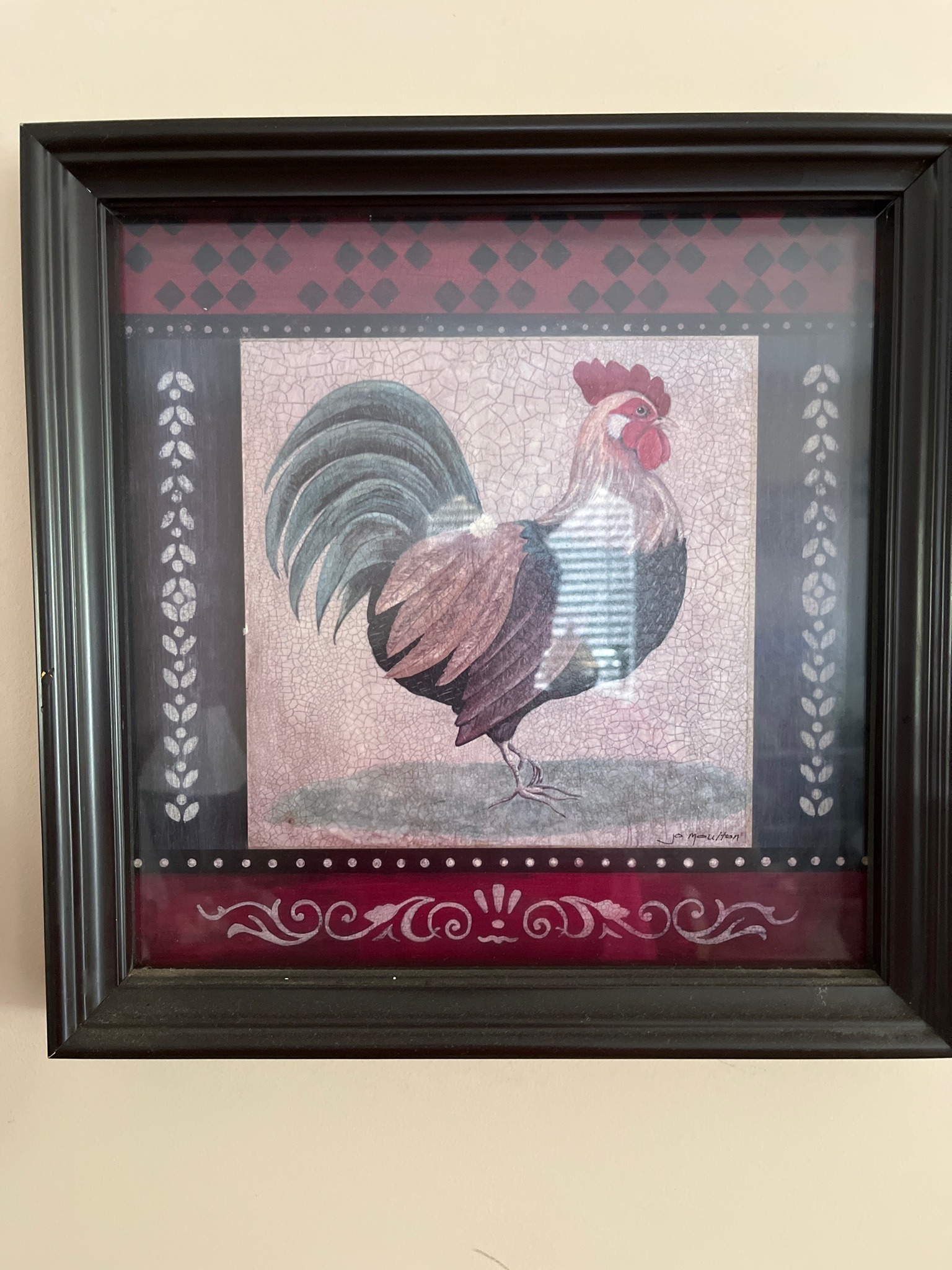 This item is a framed decorative art print featuring a stylized rooster, created by the artist Jo Moulton. The artwork is executed in a contemporary country folk art style, characterized by a central square panel depicting a rooster against a heavily crackled, tea-stained parchment or plaster-textured background. The bird is rendered in muted tones of ochre, sage green, and burgundy, with a distinctive red comb and wattle. The central image is bordered by a complex, multi-layered frame-within-the-print: the top contains a black and burgundy diamond harlequin pattern; the sides feature vertical panels with a cream-colored vine-and-leaf stencil motif on a black ground; and the bottom contains a sophisticated burgundy panel with ornate cream-colored scrolls and flourishing filigree. The signature 'Jo Moulton' is clearly visible in the lower right corner of the central panel. The artwork is housed behind glass in a deep-profile, stepped black wooden frame with a matte finish. Physically, the piece appears to be in good vintage condition, though the frame shows some minor dust accumulation and light surface scuffing. The 'crackle' effect on the rooster's background is a manufactured aesthetic choice intended to simulate age and weathered plaster, consistent with late 20th-century Americana and farmhouse decor trends. The overall composition is balanced and utilizes a warm, earthy color palette typical of Moulton’s popular decorative works.