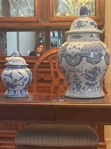 A pair of decorative blue and white porcelain lidded ginger jars of varying sizes, featuring traditional Chinese motifs. The larger jar, approximately 16 to 18 inches tall, exhibits a classic baluster form with a domed lid topped by a pointed finial. Its intricate underglaze blue decoration includes a repeating dragon motif, Ruyi borders, stylized floral patterns, and a diamond-hatch lattice band around the shoulder. The smaller jar, approximately 8 to 10 inches tall, features a more rounded ovoid body with scenes of birds and blooming flowers. Both pieces are crafted from white porcelain with a high-gloss glaze finish. The hand-painted or transfer-ware applications show variations in blue tonality typical of Chinoiserie reproductions. These items appear to be late 20th-century decorative pieces rather than antique Ming or Qing artifacts, evidenced by the uniformity of the glaze and the weight distribution. Both jars are in good aesthetic condition with no visible cracks or significant chips, though minor shelf wear is present on the base rims. No maker's marks or signatures are visible in the current orientation.