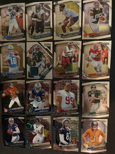 This is a collection of 16 modern American football trading cards from various Panini Prizm releases, primarily spanning between approximately 2021 and 2024. The cards are standard 2.5 x 3.5 inch trading card size, constructed from high-gloss cardstock with a metallic 'Prizm' finish that reflects light. The collection features a mix of veteran stars like Dak Prescott and Alvin Kamara, alongside rookies (identified by the 'RC' logo) such as Nick Emmanwori and Alfred Collins. Notably, one card in the second row features a 'Jalen Hurts Premier' design with a green jersey swatch embedded into the card (player-worn or game-used relic), adding significant collector interest. Other cards exhibit special 'parallel' finishes, including the 'Mosaic' or 'Lazer' pattern seen on the Javonte Williams, Alfred Collins, Alvin Kamara, and Luther Burden III cards, which utilize complex geometric prismatic backgrounds. The cards appear to be in raw, ungraded condition. While most edges look crisp, there is slight visible corner softening on some cards, and the reflective surfaces are prone to micro-scratching. All items center on the NFL (National Football League) and represent a mid-to-high tier of modern sports card manufacturing known for its high-quality chrome-like finish and brand prestige.