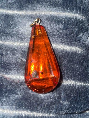 This item is a faceted amber pendant, expertly carved into an elongated teardrop or pear shape. The material displays a deep, warm honey-to-cognac transparency with a rich orange-brown hue. A significant feature of this piece is the presence of internal organic inclusions, including dark speckles and a larger opaque debris cluster toward the base, which suggests it is comprised of natural fossilized tree resin rather than synthetic mimicry. The surface is polished to a high gloss, though close inspection reveals minor surface scratches and internal 'sun spangles' (stress fractures) consistent with authentic aged amber. The pendant measures approximately 2 to 3 centimeters in length. It is topped with a simple metal jump ring, likely brass or gold-plated, which shows signs of light oxidation and wear. The faceting along the edges is crisp but shows slight softening, indicating it may be a vintage piece from the mid-20th century. There are no visible maker's marks or hallmarks on the pendant itself. The overall craftsmanship is refined, showcasing the natural depth and clarity of the resin while preserving its unique geological history. This type of jewelry is characteristic of Baltic amber pieces frequently produced in Northern and Eastern Europe.
