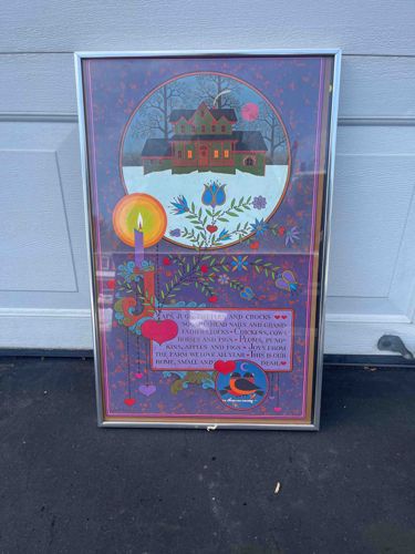 This item is a large-format, framed lithographic print featuring the distinctive folk-art style of illustrator Mary Engelbreit. The vertical composition is housed in a slim, metallic silver-toned frame with glass glazing. The artwork is characterized by a vibrant and saturated color palette, dominated by deep purples, oranges, and festive greens. The central motif consists of a circular vignette showing a large Victorian-style farmhouse set against a winter landscape with silhouettes of bare trees. Below this, a stylized floral arrangement leads to a purple candle with a glowing yellow and orange halo. The bottom portion features a rectangular text block containing an endearing poem about home and farm life, bordered by small red hearts. A secondary circular vignette at the bottom right depicts a pair of birds in a nest under a crescent moon. The piece demonstrates high-quality offset lithography with sharp linework and rich ink saturation typical of late 20th-century commercial art. It is in very good vintage condition, though the paper appears to have a slight horizontal wave or 'cockling' near the middle, likely due to humidity or improper mounting. No significant fading or mechanical damage is visible through the glass. This piece likely dates to the late 1980s or 1990s, when Engelbreit's 'Home is Where the Heart Is' aesthetic was at its peak popularity.