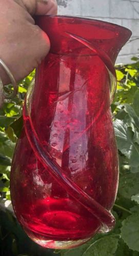 Mid-Century Modern Ruby Red Crackle Glass Vase with Applied Swirl