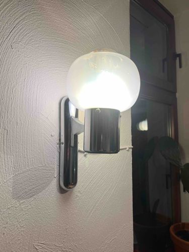This is a wall-mounted lighting fixture, specifically a sconce, featuring a design characteristic of the Mid-Century Modern or Space Age aesthetic, likely dating from the 1960s or 1970s. The fixture is constructed with a slim, vertical, elongated chrome-plated metal base that attaches to the wall. This mounting bar has rounded ends and a high-polish reflective finish. Extending from the upper portion of the base is a short horizontal arm that supports a cylindrical chrome socket housing. Atop this housing sits a spherical, frosted white glass globe. The glass has a soft, matte texture designed to diffuse light evenly. The construction shows typical industrial techniques of the mid-20th century, with visible screws holding the glass shade to the metal base. In terms of condition, the chrome appears to be in good vintage state with minimal visible pitting, though some fingerprints and surface dust are present. The glass globe is intact without visible cracks or chips. The hardware mounting the unit to the textured plaster wall appears somewhat improvised or aged, with a white electrical wire partially visible and some slight gaps in the flush mounting. While no maker's mark is immediately visible in this view, the style is reminiscent of European manufacturers like Staff Leuchten or Bega.