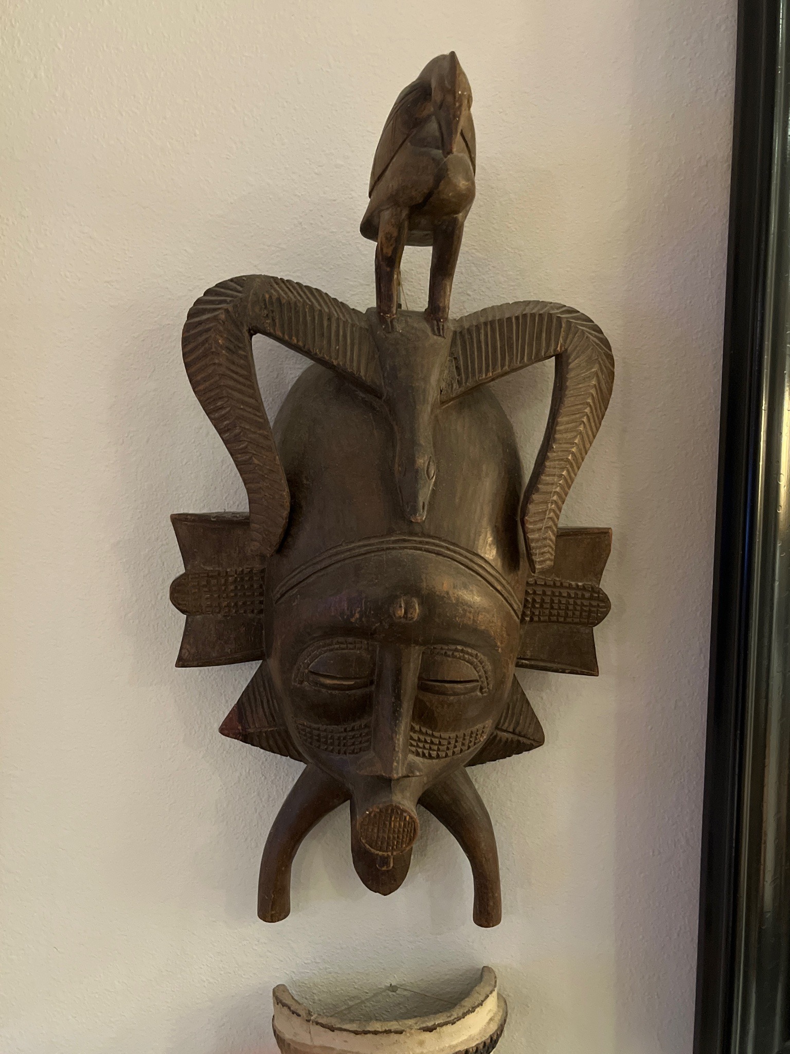This is a hand-carved wooden kpelie mask, an anthropomorphic mask originating from the Senufo people of Ivory Coast, West Africa. The mask features a smooth, vaulted forehead and an elongated face, culminating in a protruded rectangular mouth with incised geometric patterns. It is characterized by its complex symmetry, including two downward-curving elements at the chin and stylized side projections commonly referred to as 'ears' or 'wings,' which feature cross-hatched incisions. A highly distinctive superstructure decorates the top, consisting of two large, horizontally ribbed horns flanking a central figure of a hornbill bird—a sacred symbol in Senufo cosmology representing fertility and growth. The mask is carved from a single piece of dark, dense wood with a deep brown, semi-lustrous patina, suggesting age and frequent handling or polishing. Visible wear includes minor characteristic scuffing on projecting edges, a slight drying of the wood grain, and small circular punctures near the hairline presumably for attachments. The craftsmanship is evident in the precise execution of the fine geometric scarification patterns around the almond-shaped, slit eyes and cheek areas. Based on the stylistic execution and surface condition, the piece likely dates to the mid-to-late 20th century and was likely produced as an ethnographic art piece for the collector market, though it maintains the traditional proportions used in Poro society ceremonies.
