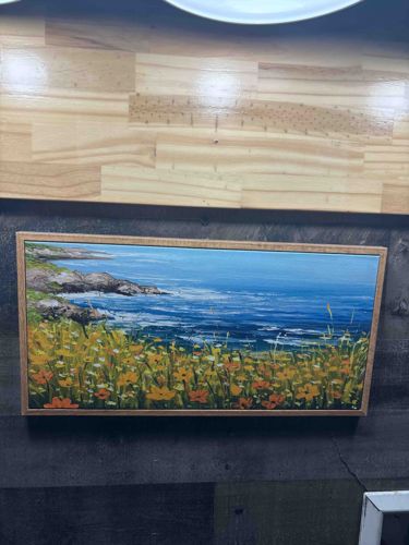 This is a contemporary impressionist-style landscape painting presented in a horizontal panoramic format. The artwork depicts a vibrant coastal scene featuring a foreground densely populated with yellow and orange wildflowers, possibly California poppies or similar coastal flora, transitioning into a rugged rocky shoreline. The middle ground showcases a deep blue sea with whitecaps indicating gentle wave action against the jagged rocks on the left. The sky and water blend harmoniously in shades of azure and cerulean. The medium appears to be acrylic or oil on canvas, characterized by thick, textured brushstrokes and impasto techniques that add depth and movement to the floral field and the ocean waves. The painting is housed in a simple, slim-profile natural wood 'floating' frame that provides a modern, clean finish. The construction suggests a late 20th to 21st-century origin. Condition appears excellent with no visible signs of cracking, fading, or damage to the canvas or the frame. The colors remain bright and saturated, and the craftsmanship reflects a skilled hand capable of balancing fine detail in the flowers with broader, expressive strokes in the landscape. No visible artist's signature is detectable in the current view, which is common in floating frame mounts where signatures may be tucked near the edge or on the reverse.