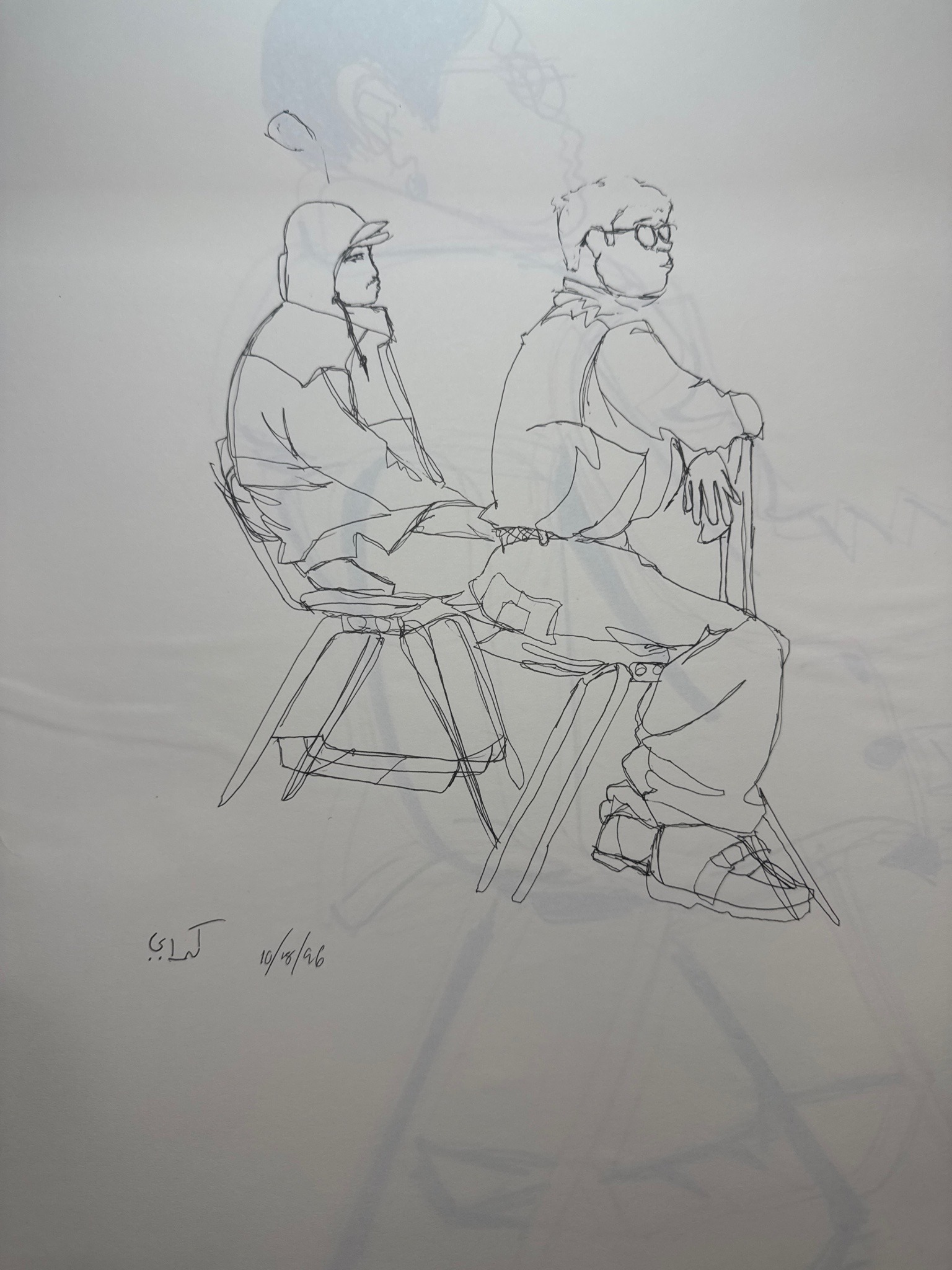 This artwork is an original ink-on-paper figurative sketch dating to October 18, 1996, as indicated by the handwritten date at the bottom left. The piece depicts two male figures seated side-by-side in profile, executed with a confident, gestural hand using black ink. The figure on the left is wearing a hooded jacket and a cap, while the figure on the right is wearing glasses, a sweater, and heavy boots. The draughtsmanship is characterized by fluid, overlapping lines that suggest form and movement rather than precise anatomical detail. A notable element is the faint 'ghost' image or pentimento visible in the background—a larger, more abstract outline of a head—suggesting the artist may have been working on a thin or translucent medium or that ink from another page has transferred. The paper appears to be a light cream or off-white artist's stock with visible vertical undulations, likely due to the application of wet ink or its removal from a bound sketchbook. The artist's signature or initials in a stylized script (possibly 'Khai') accompanied by the date '10/18/96' serves as the primary identifier. The condition appears fair, with minor paper buckling and no visible tears or significant foxing, though some light smudging of the ink is present consistent with a rapid life-drawing session.